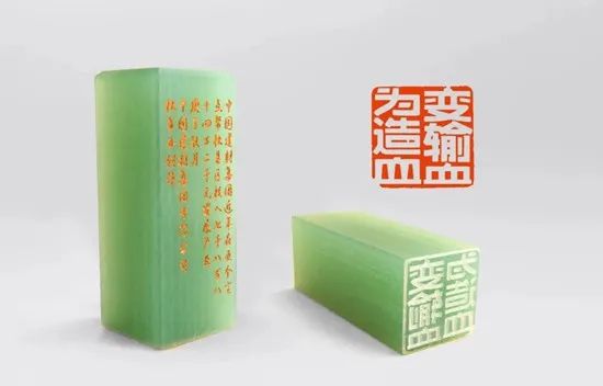 “這個印章的材質(zhì)好漂亮,像青玉一樣。是用真的玉篆刻的嗎?”在燈火通明的玻璃展示架前,有游客詢問講解人員。